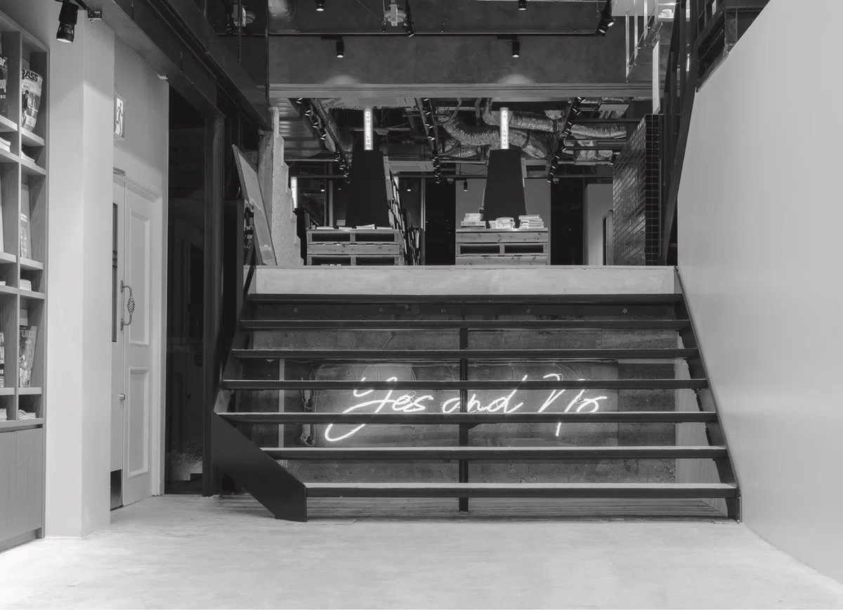 これはスマイルズが文喫をプロデュースした際、僕がクライアントに内緒でエントランスフロアからスキップフロアに上がる階段の裏側にネオン管で制作したアートワークです。運良く気に入っていただき、事なきを得たのではありますが(笑)。