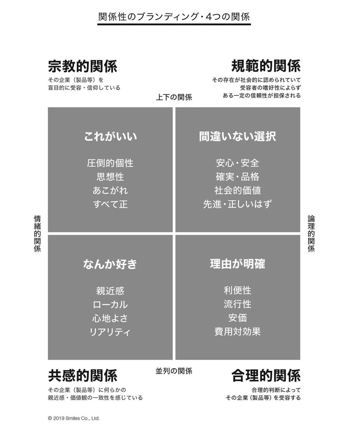 スマイルズが提唱するブランディングの考え方として「関係性のブランディング」というものがあります。 自著『自分が欲しいものだけ創る(日経BP)』でも紹介していますが、 これは企業やブランドを擬人化して、そのステークホルダーとの信頼構造の性質について分類したものです。