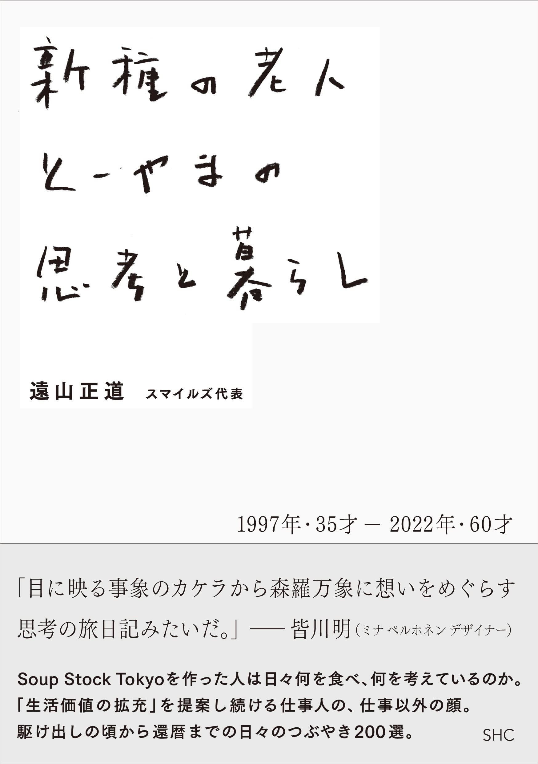 「Soup Stock Tokyo」を作った人は、日々何を食べ、何を考えているのか―。1997年(35歳)-2022年(60歳)まで遠山が連載を続ける月刊誌「味の手帖」(株式会社味の手帖発行・昭和43年創刊)での食にまつわるエッセイ200選が一冊にまとまり、還暦を迎えるその日に書籍となります。遠山の三菱商事勤務時代から、スープストックトーキョーの構想、株式会社スマイルズの設立を経て、今日に至るまで。「生活価値の拡充」を世に提案し続ける遠山の、仕事以外の「生活の顔」を中心とした軽やかなリズムで綴られた文芸エッセイです。写真作品16頁も収録予定。本の帯文には、皆川明さん(ミナペルホネン デザイナー)より、「目に映る事象のカケラから森羅万象に思いをめぐらす思考の旅日記みたいだ。」と寄せていただきました。還暦を前に、自らを「新種の老人・1期生」と名乗るその理由が、遠山の見る景色の一端から徐々に明らかになっていきます。